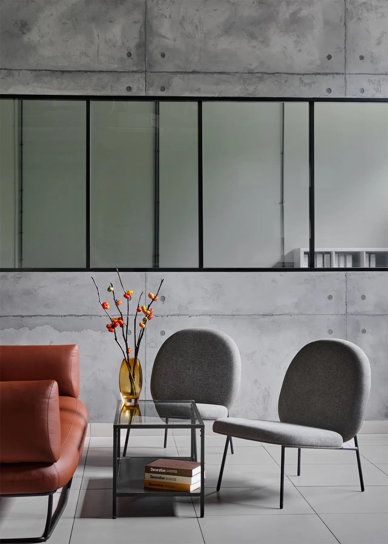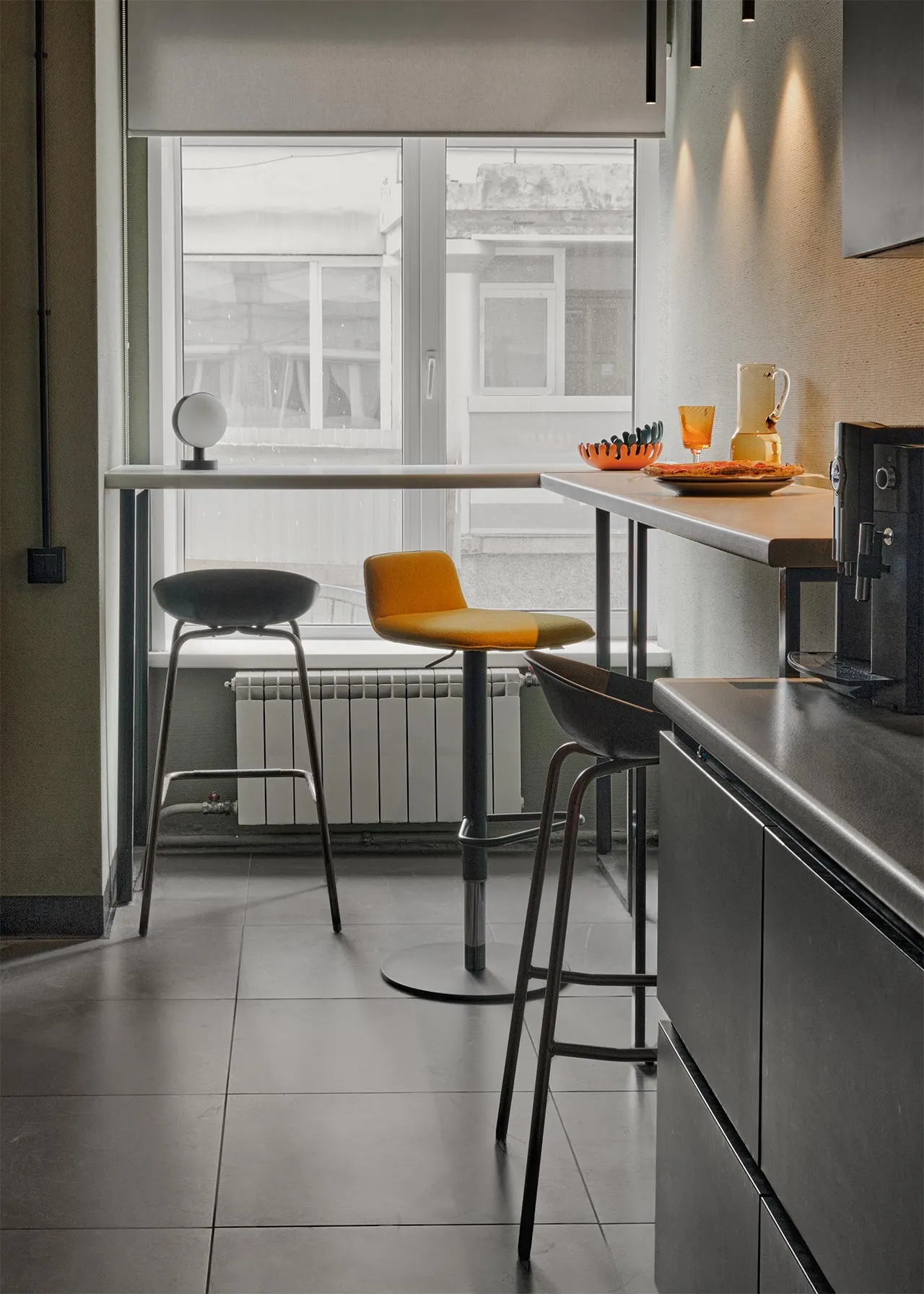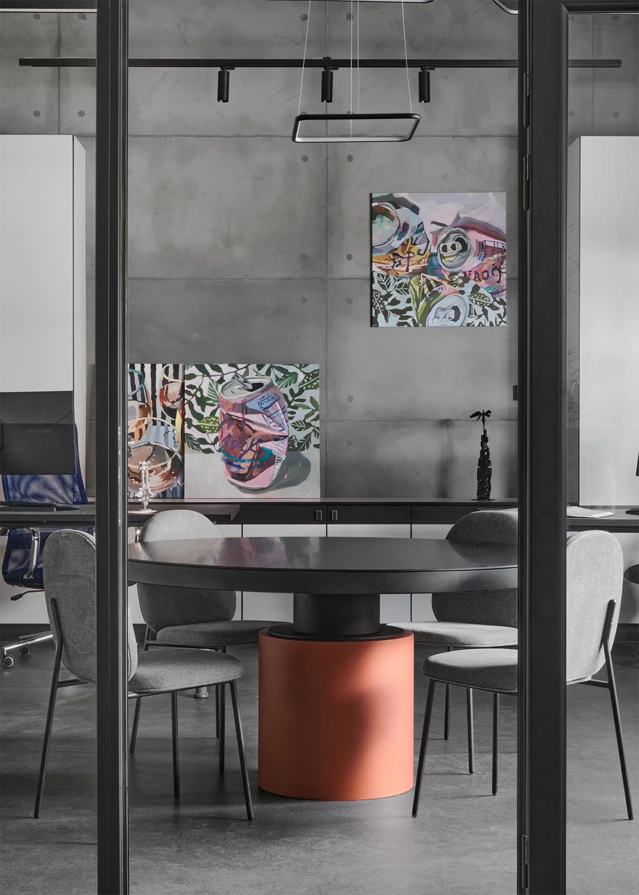 Интерьер вдохновлен индустриальной эстетикой: серые стены с эффектом бетонных плит создают нейтральный фон, на котором ярко выделяются акцентные элементы. Пространство организовано с помощью стеклянных перегородок и дверей — это сохраняет ощущение простора и обеспечивает визуальную связь между зонами. Пространство включает: