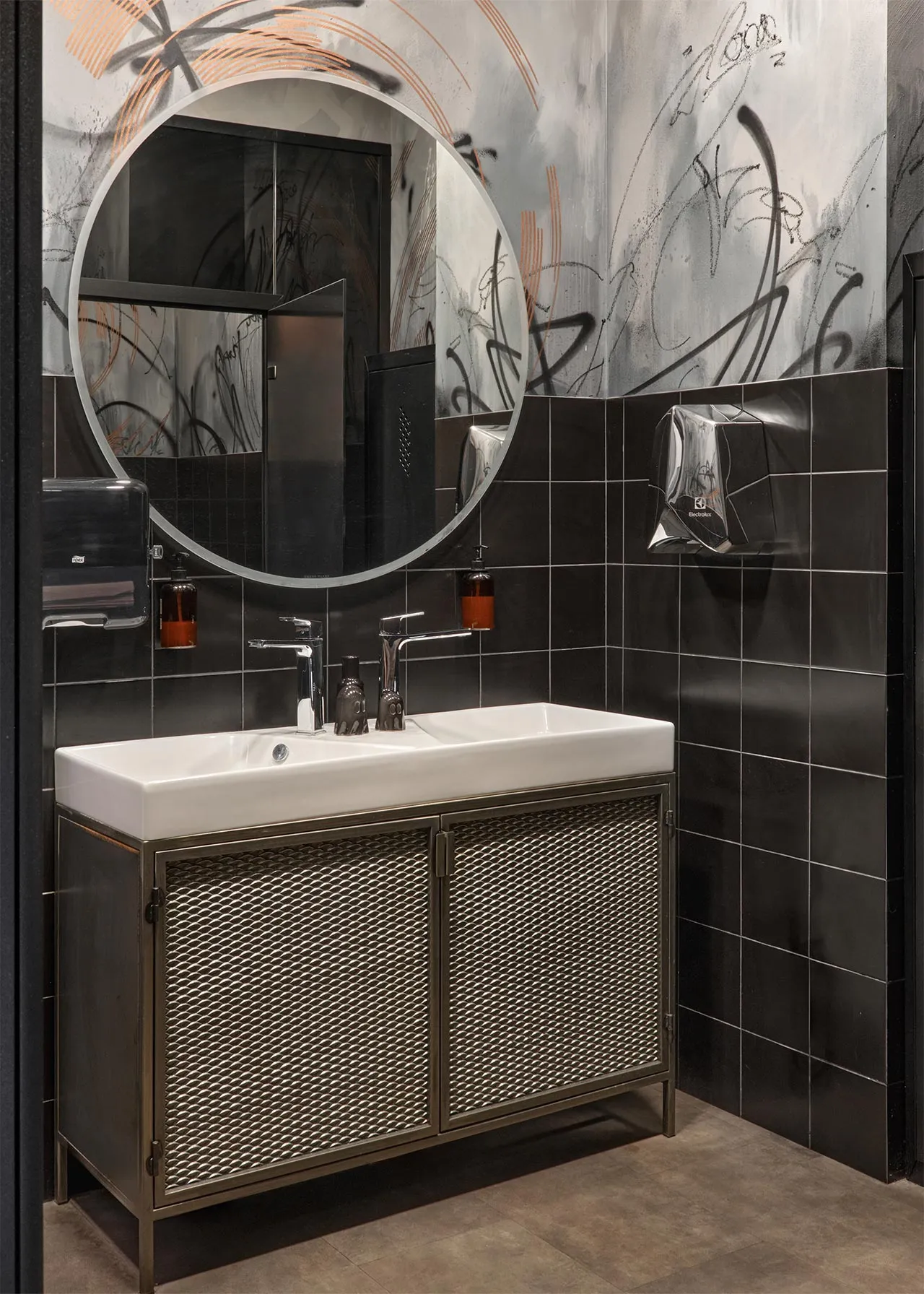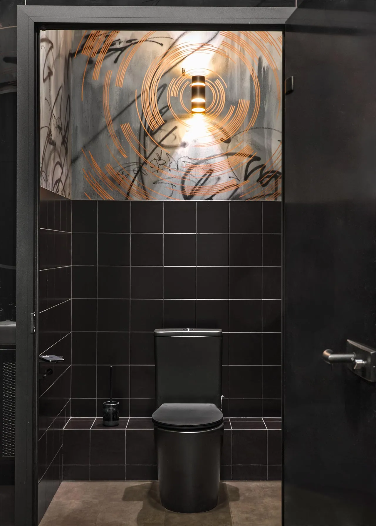 Санузел стал арт-объектом с графичными росписями и металлическими элементами. Яркие цветовые акценты мебели (терракотовый, синий, бордовый) контрастируют с монохромной базой, создавая динамичный и современный образ.